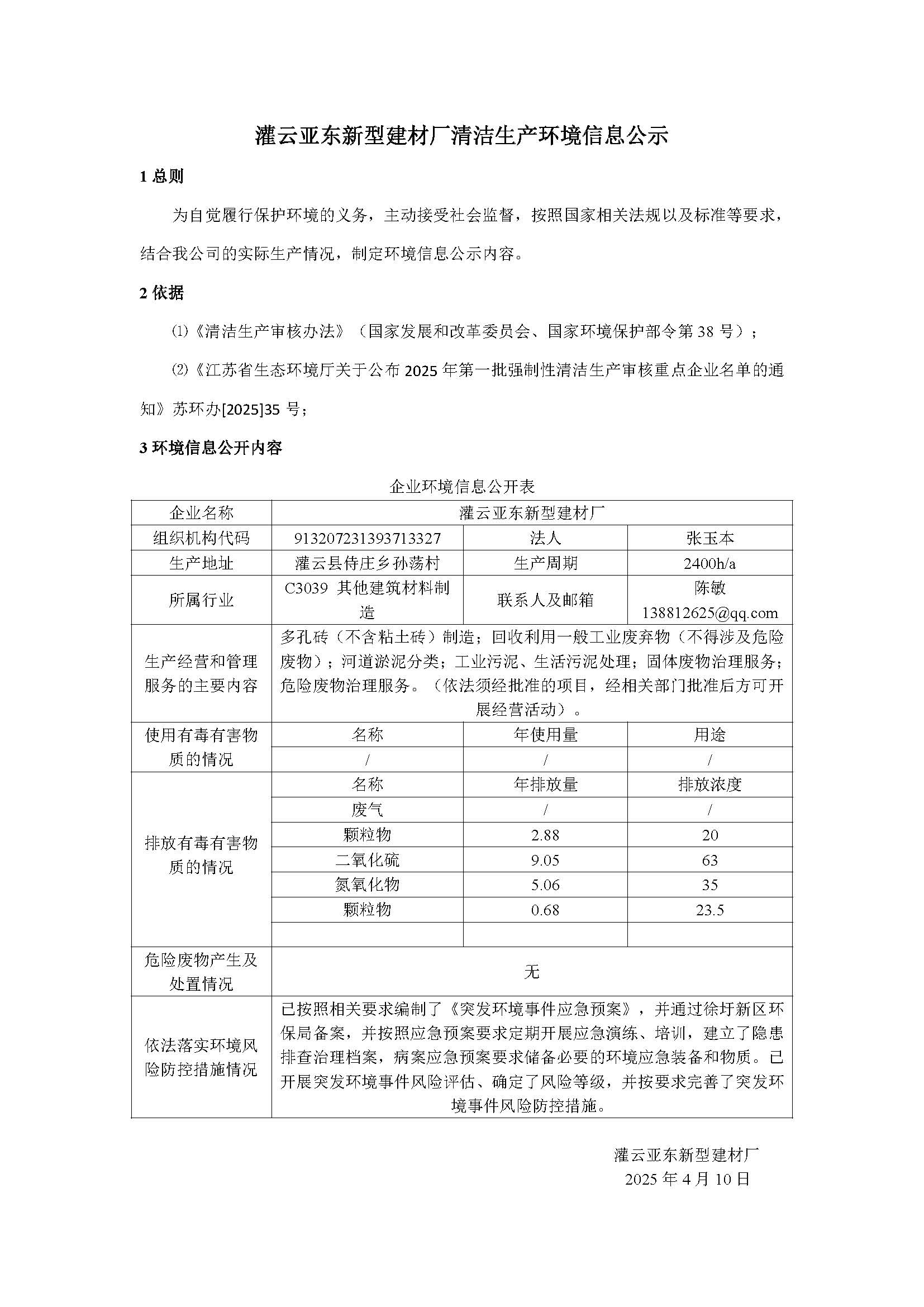 為深入推進連云港市污染物減排工作,根據《江蘇省生態環境廳關于公布2025年第一批強制性清潔生產審核重點企業名單的通知》蘇環辦[2025]35號,公司須實施清潔生產審核。現將公司基本情況公示如下 :